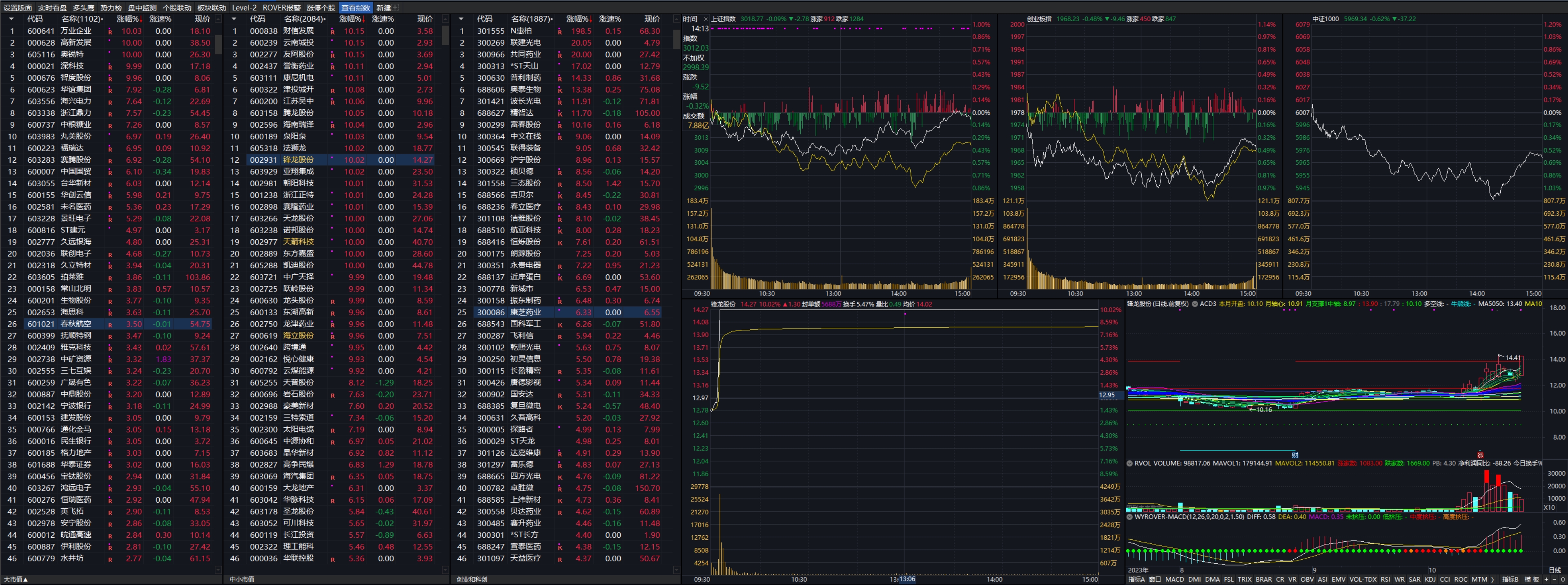 因为不需要 60 看全体 A 股涨幅排行和涨速排行,另外需要把 20cm 涨停的票分开,优先追市值 100 亿以下的票。弄了一个通达信版面: